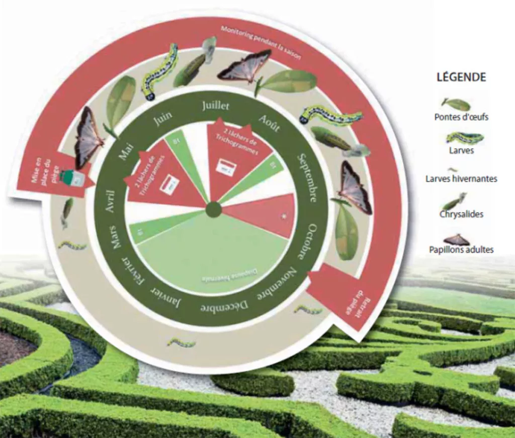 La pyrale : du piégeage en préventif et des produits par ingestion en curatif Jardins de MarqueyssacFor optimum effectiveness against the Box Caterpillar, apply the Bioline integrated pest management programme: